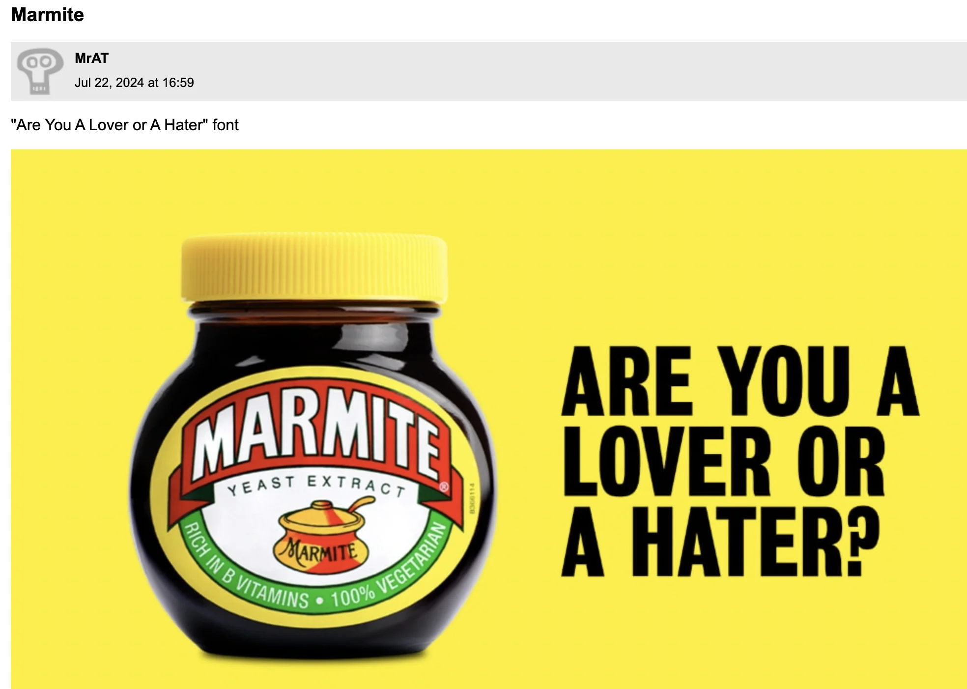 I evaluated only two LLMs: gpt-4o-mini and gemini-2.5-flash-preview-05-20. Each LLM is provided with the image uploaded by the user, the title of the thread, and a description if there is one. Providing these last two pieces of context is important, because some images contain several fonts, and the title or description may help the LLM focus on the right one. Take for instance this Marmite image: