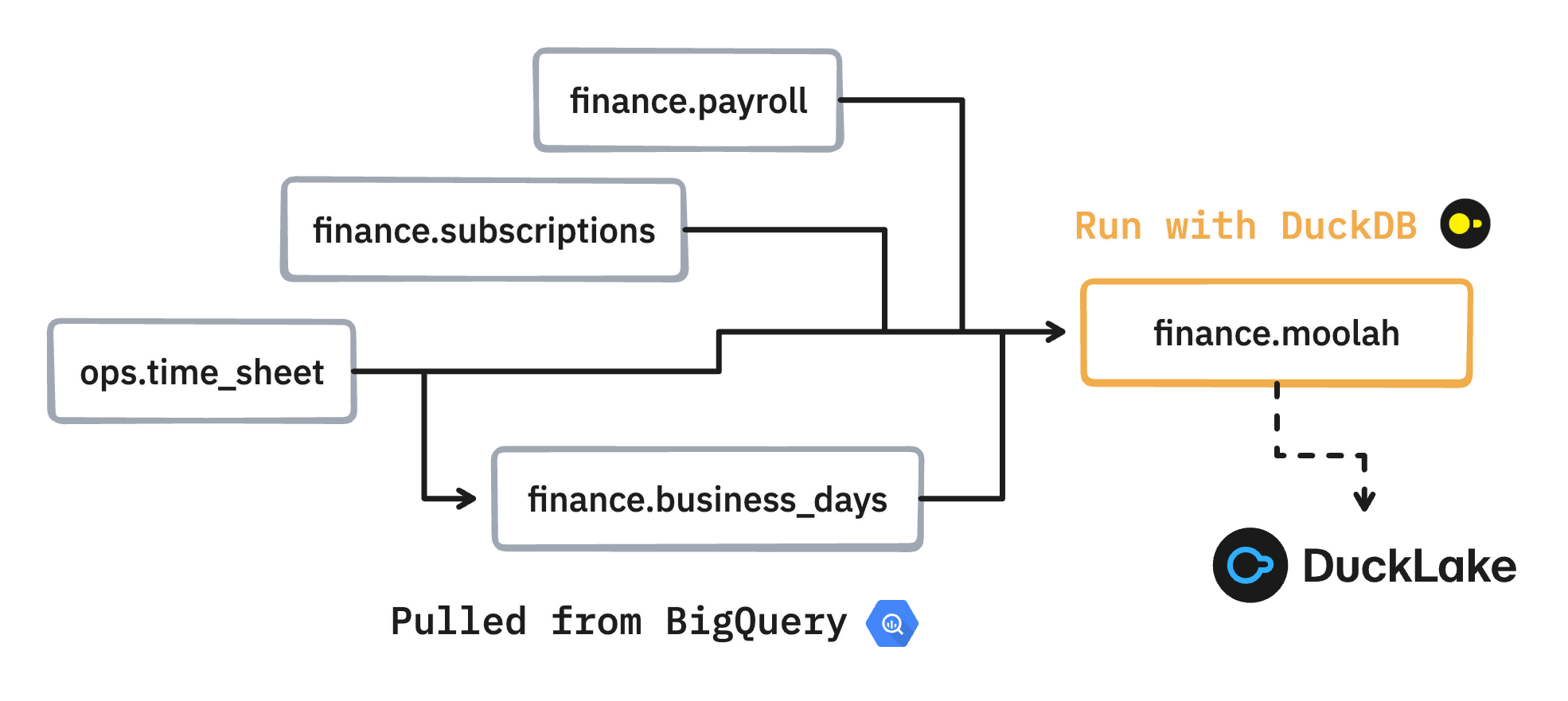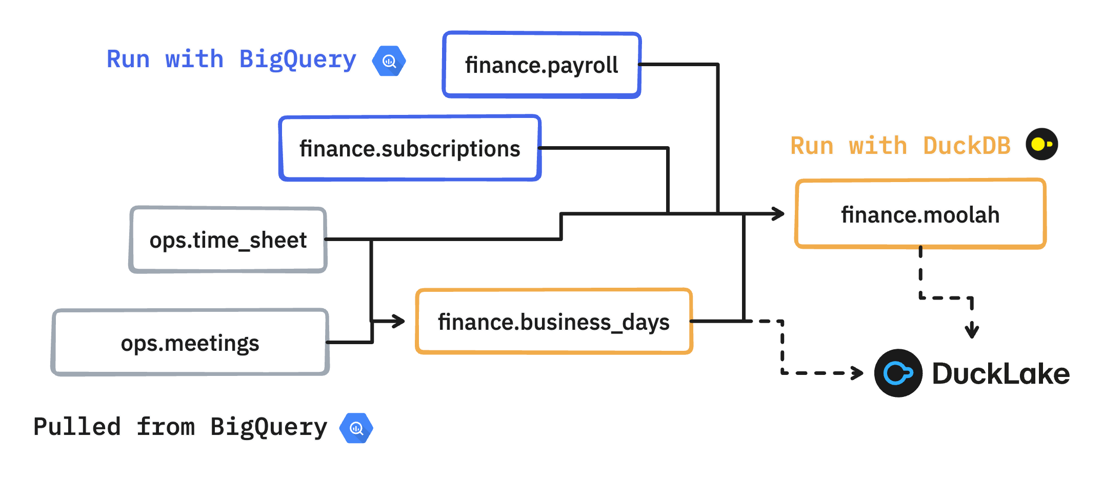 finance.payrollandfinance.subscriptionshave external dependencies (third-party data) and therefore can only be run with BigQuery. DuckDB can’t execute them because of access issues, which is fine.ops.time_sheetandops.meetingsare not part of the selected views, but are necessary to refresh those that are. They are therefore pulled from BigQuery into DuckLake prior to execution.finance.business_daysdependencies have been pulled, which enables local execution.finance.moolahdepends onfinance.business_dayswhich has been materialized locally. It also depends onfinance.payrollandfinance.subscriptions, which have been materialized in BigQuery. There’s alsoops.time_sheetwhich has already been pulled down. The script can tap into all four dependencies, from both sources, and run locally.